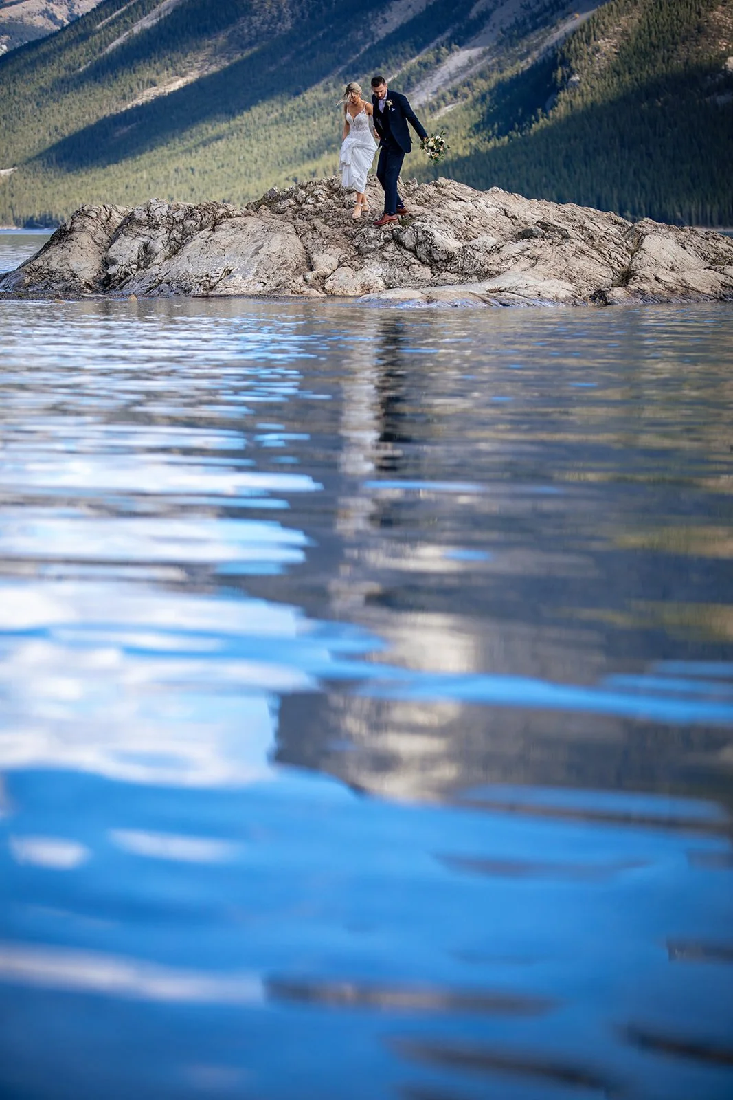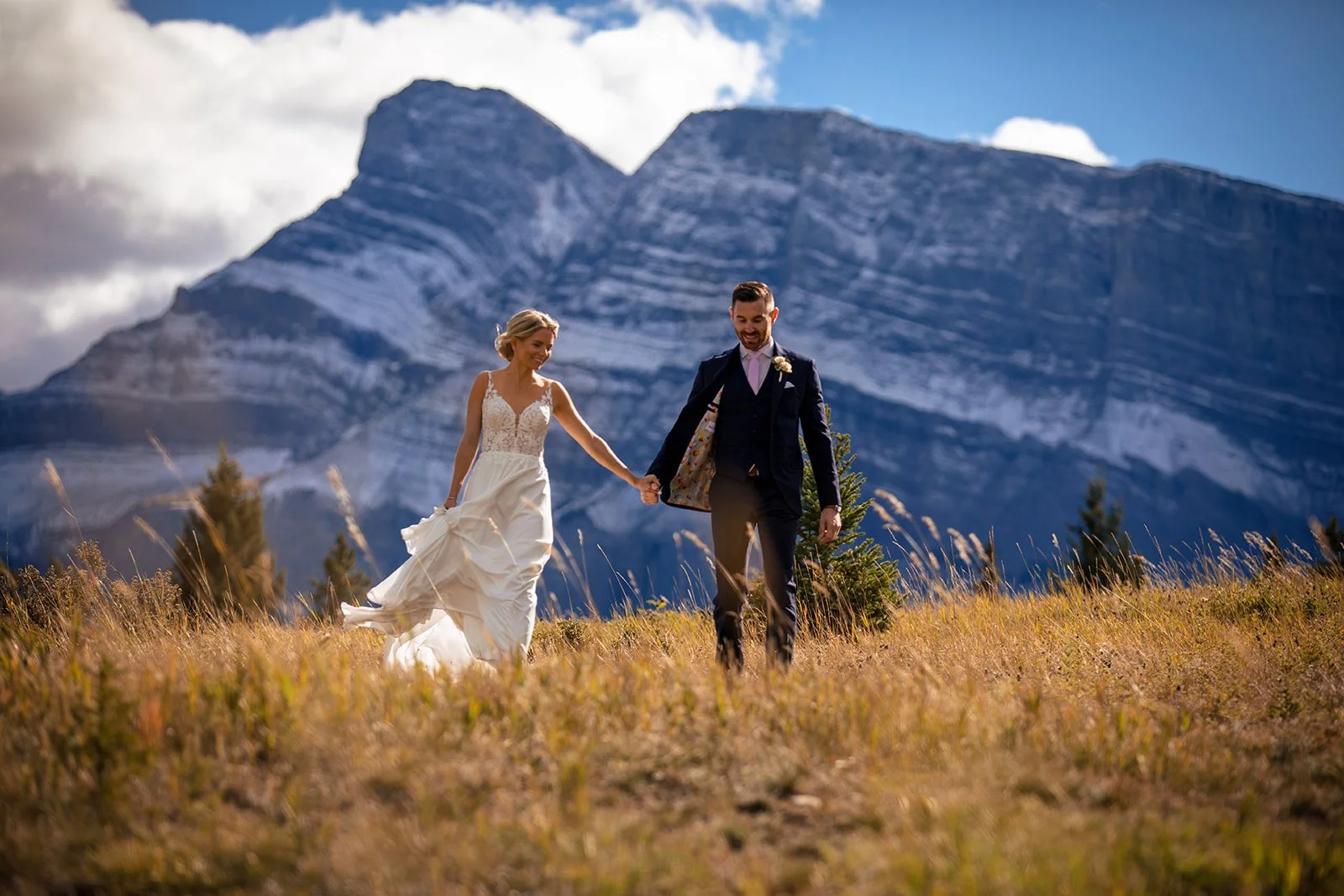 After some photos together at Cascade Ponds, we continued the tour stopping at Lake Minnewanka for a few more wedding party photos. With some shared moments under the sun on the shoreline, the wedding party departed in the limo and R & J stayed with us a little longer to get some more couples portraits in this amazing location. We love Lake Minnewanka as it provides a lot of options photographically and even with other visitors in the Parks, it never feels crazy busy like some other iconic locations in Banff National Park. Before long it was time to make our way to the Banff Gondola but on the way we couldn’t resist a final few photos with some amazing light in the meadows.