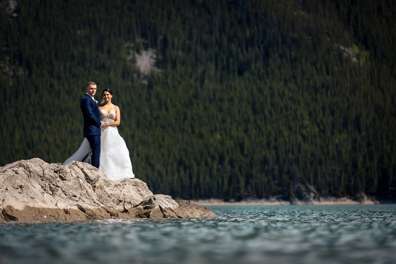 Summer elopement photos at Lake Minnewanka with local Banff Wedding Photographers