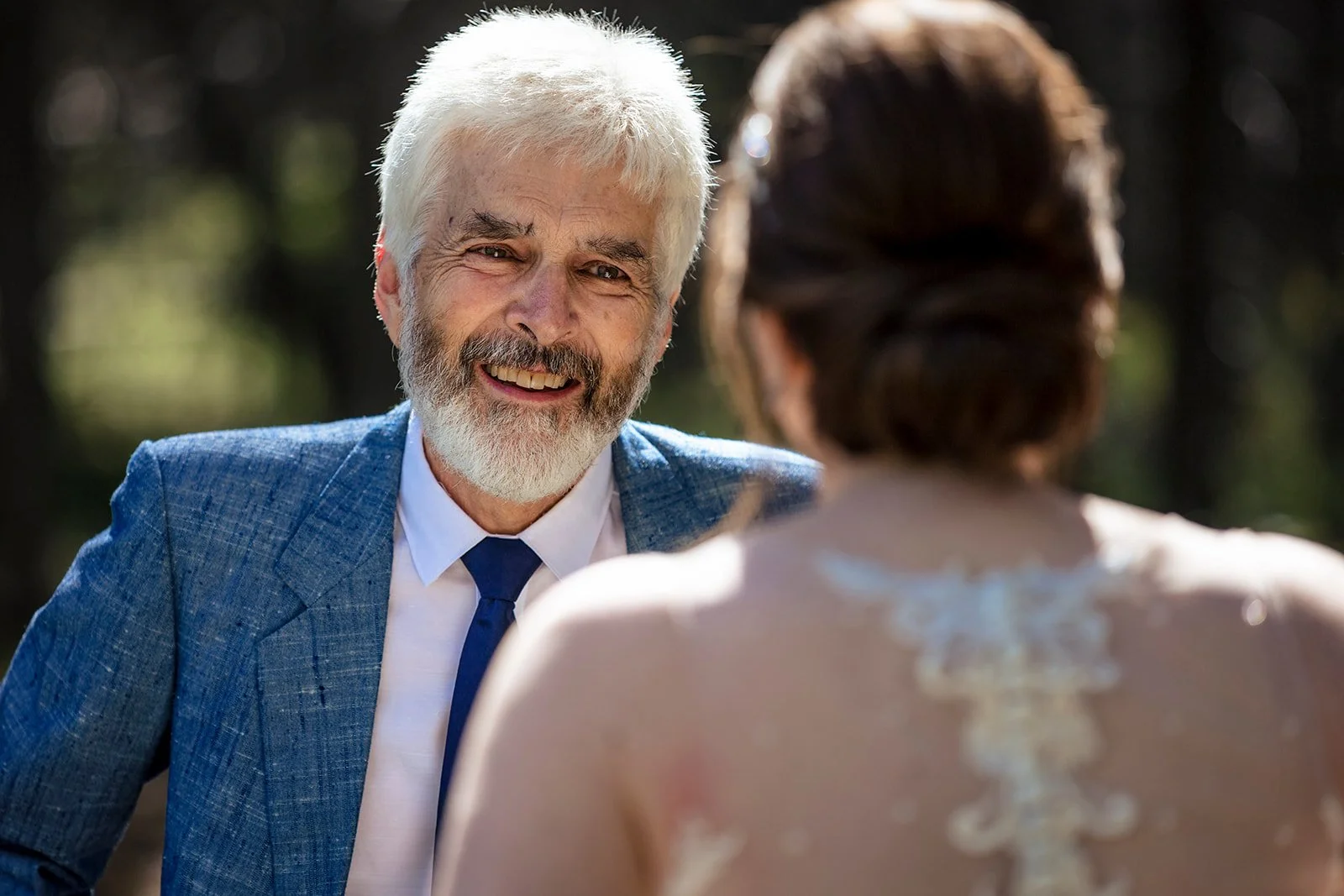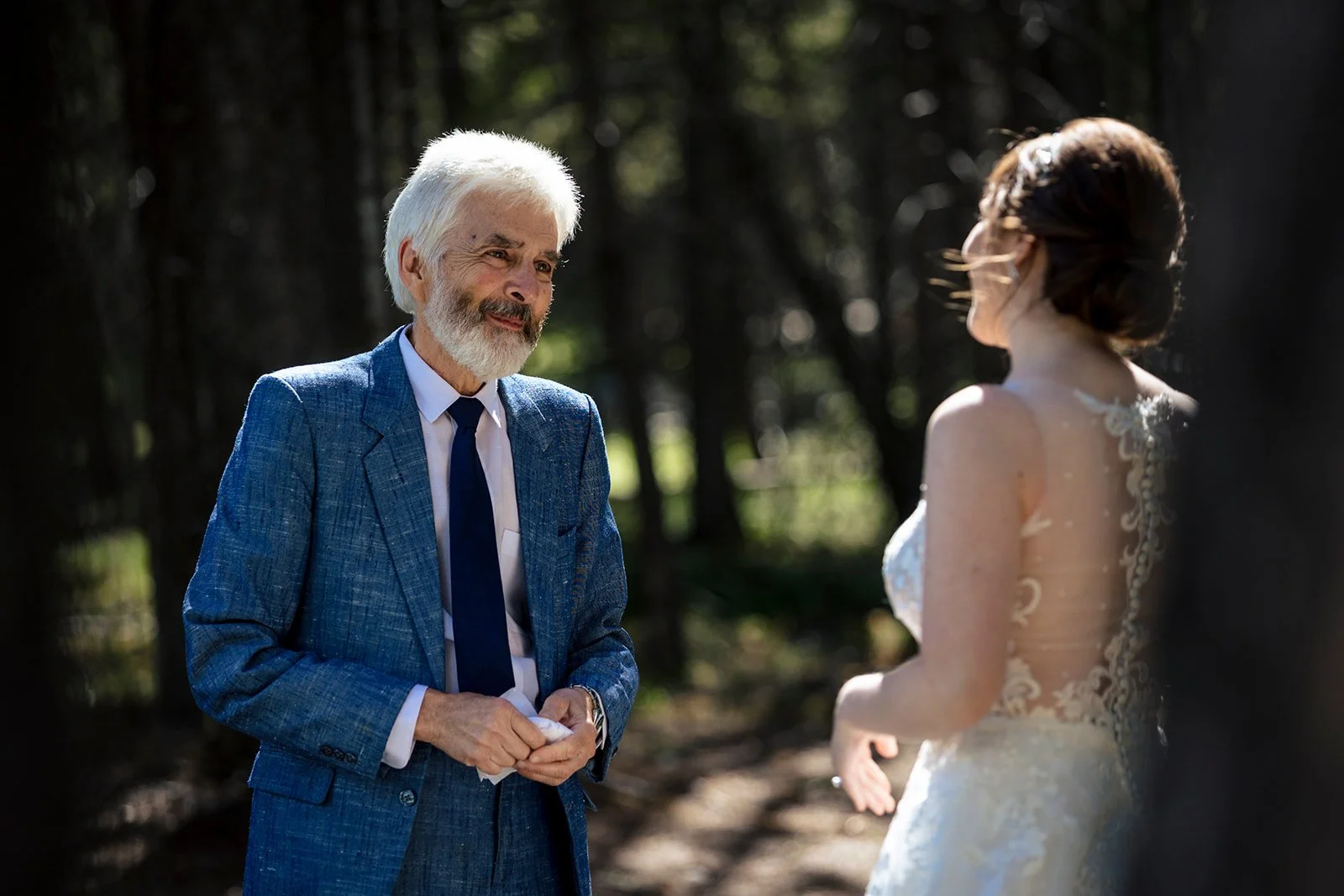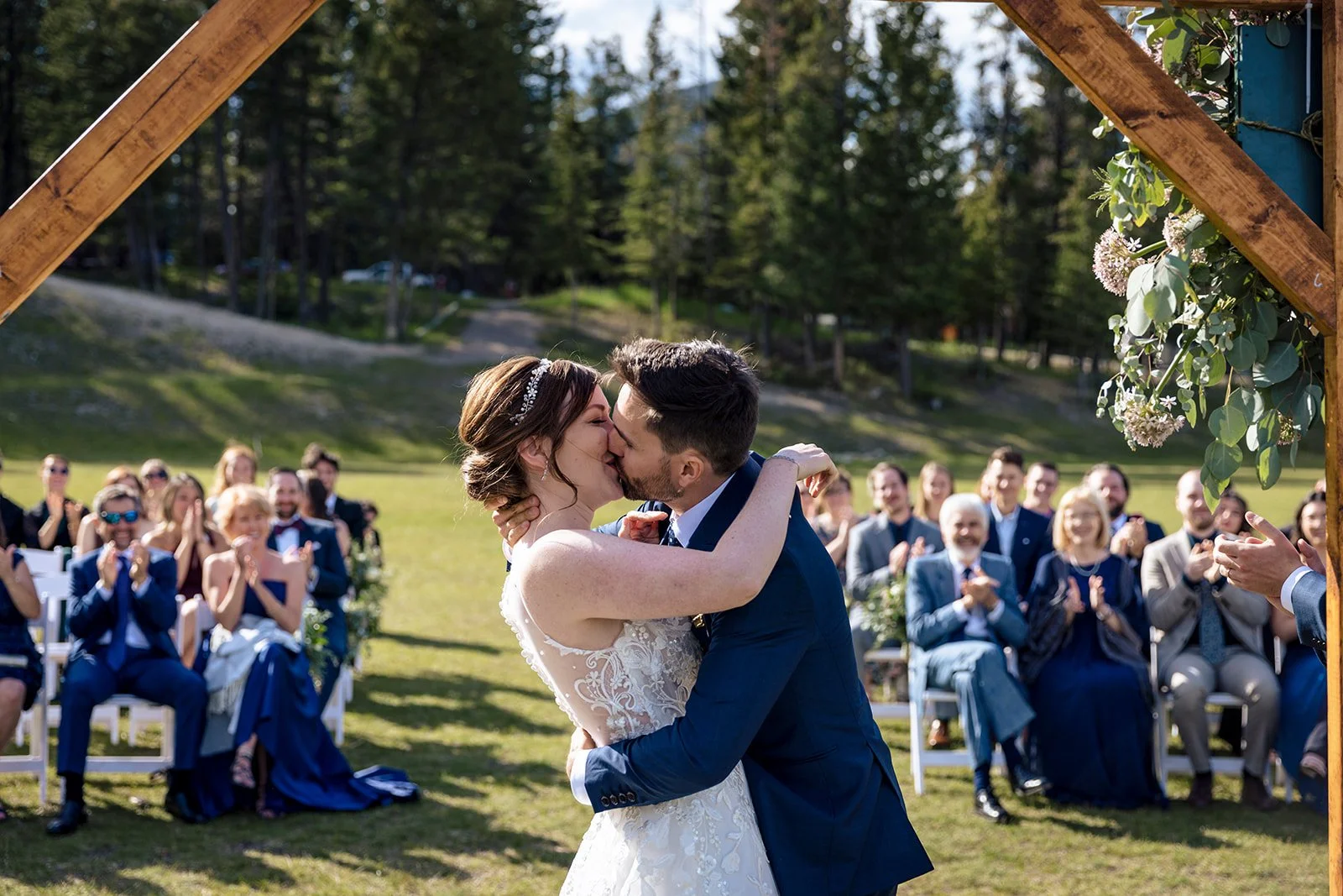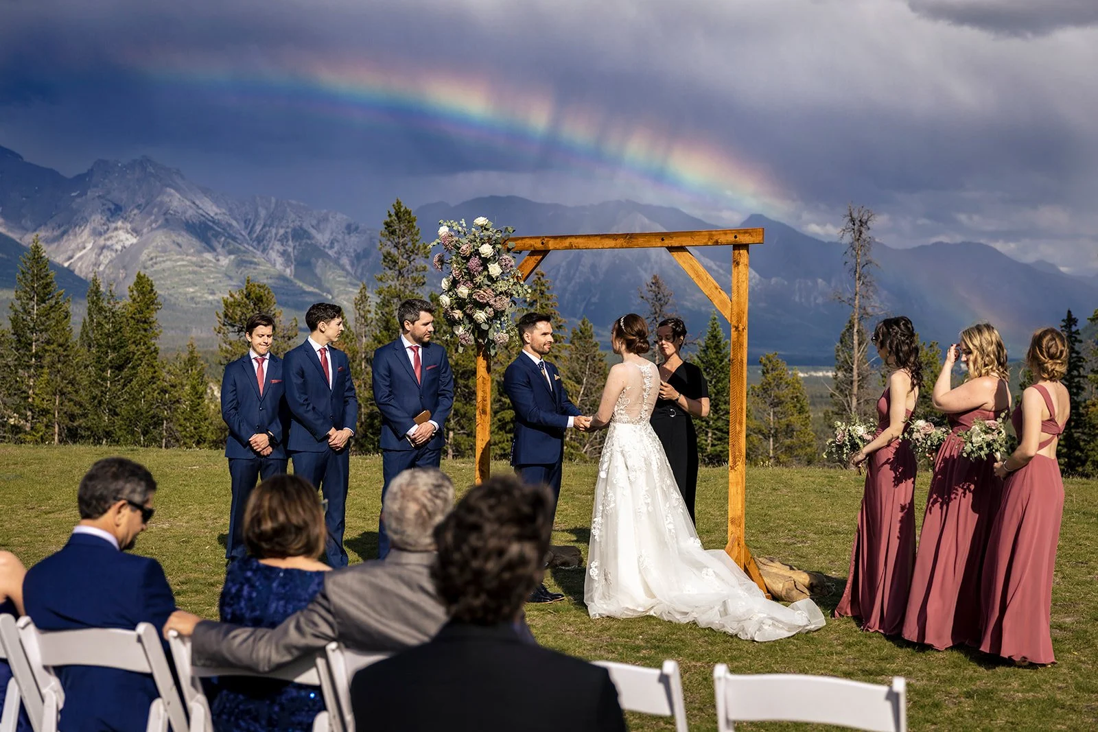 As time was drawing closer to their ceremony, we took advantage of an impromptu first look with A’s father as the stars aligned to quickly move these two into position to share this intimate moment. Before long, it was time for their outdoor Summer wedding ceremony. There was even an extra special appearance mid-ceremony from a beautifully vivid rainbow, arcing over the Bow Valley.